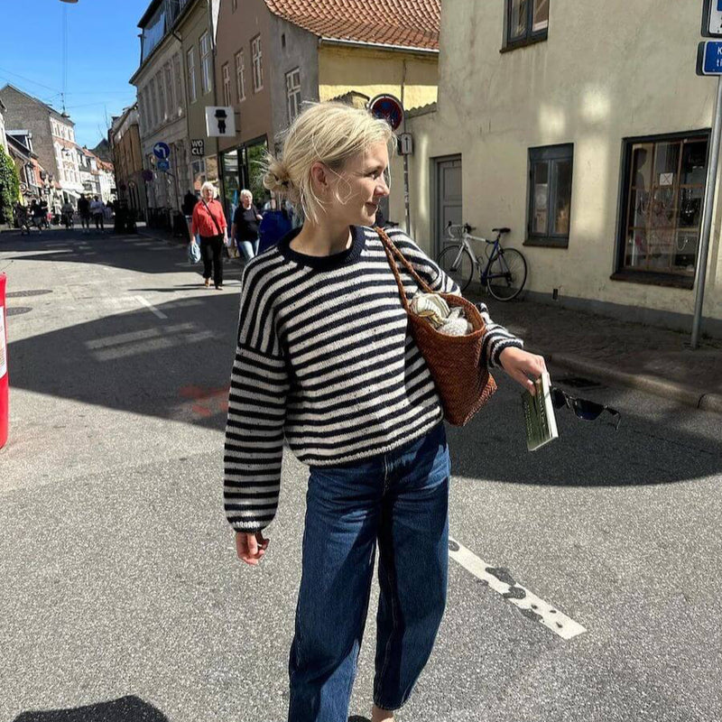 Olga Sweater neulotaan ylhäältä alas sileänä neuleena ja raidoittaen. Aluksi neulotaan takakaarroke tasona ja muotoillaan olat lyhennetyin kerroksin. Raitakuvio alkaa heti. Olat neulotaan tasona pyöröpuikoilla ja yhdistetään sitten etukappaleeksi. Etu- ja takakappaleet yhdistetään kainalon kohdalla, ja vartalo neulotaan suljettuna neuleena pyöröpuikoilla. Hihat neulotaan ylhäältä alas kädenteiltä poimituista silmukoista. Lopuksi neulotaan taitettava pääntien reunus poimituista silmukoista.